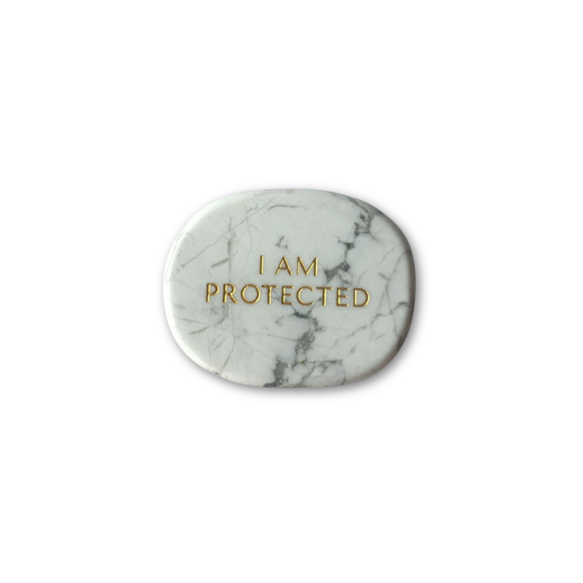 This Howlite gemstone is designed to be carried in your pocket and is engraved with the affirmation I AM PROTECTED on one side the Future You Flower on the other.